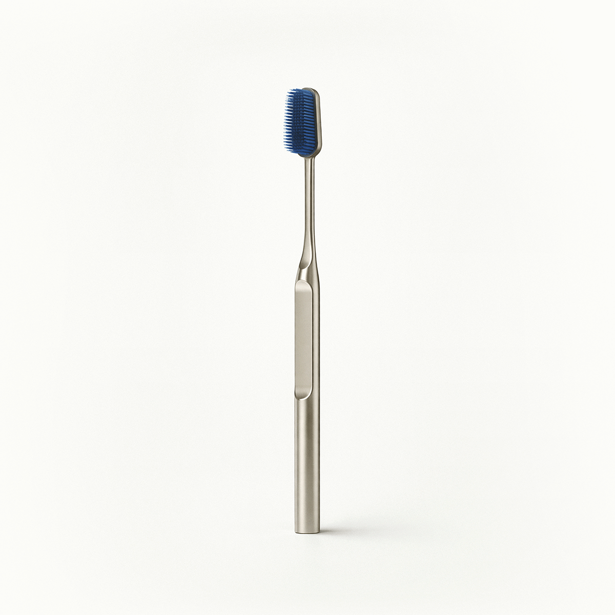 Närbild av en silverfärgad metallnyckel med ett ingraverat varumärke som förmedlar minimalistisk design, grafisk design och skandinavisk form med tydligt fokus på material, enkelhet och precision.